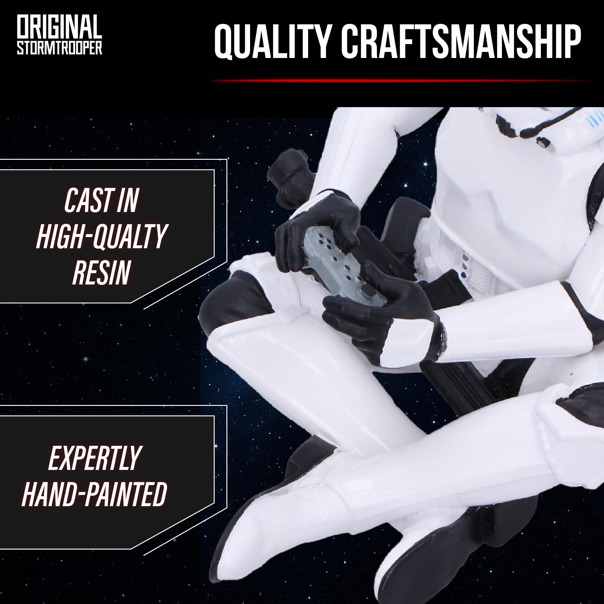 - Featuring a Stormtrooper Sitting Cross-Legged Playing a Video Game: The figurine portrays the classic Stormtrooper fully immersed in the gaming world, controller in hand, and headset on.